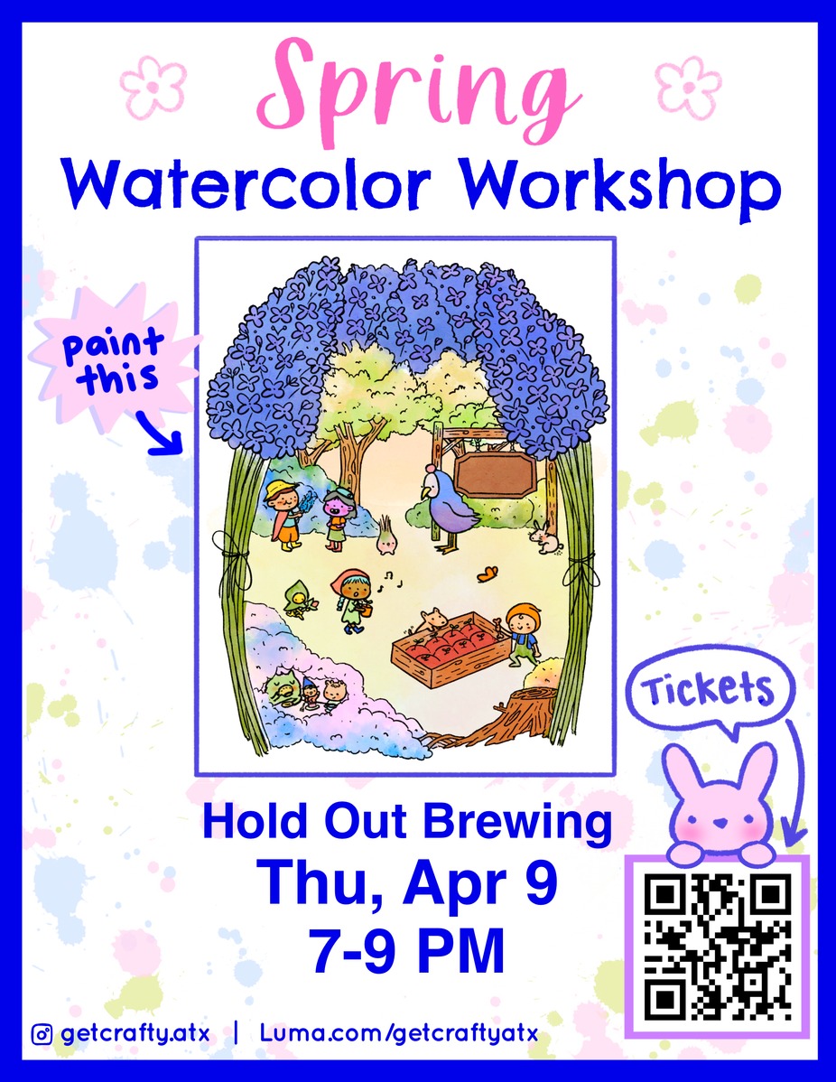 Spring is almost in the air so we’ll paint a whimsy garden scene! Learn watercolor tips/techniques and take home your painted creation! Tickets: https://luma.com/ebydvtde Monthly paint night every 2nd Thursday at Hold Out Brewing. Join our little creative community.